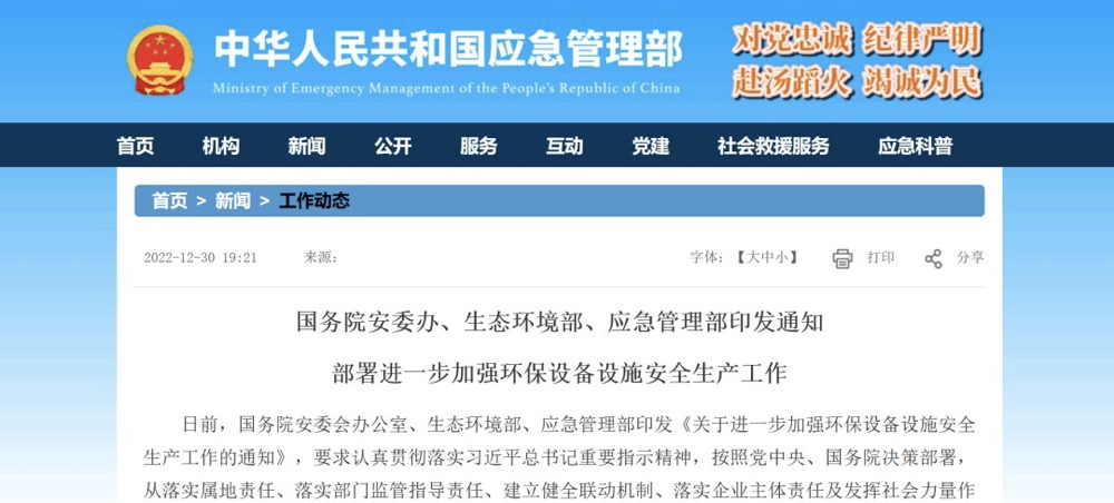 近日,国务院安委会办公室、生态环境部、应急管理部共同印发了《关于进一步加强环保设备设施安全生产工作的通知》。《通知》指出,2022年以来全国发生多起环保设备设施生产安全较大事故,引起了社会广泛关注。